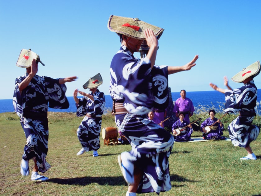 踊り方は16足(じゅうろくあし)と言い、手を叩いたり、同じ側の手足を動かしたりします。哀愁を帯びた唄と洗練された優雅な踊りをぜひご体験ください。